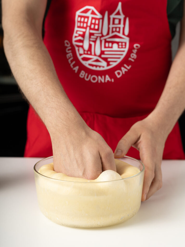Trasferiamo l’impasto in un contenitore e lasciamolo lievitare fino quasi al raddoppio. (circa 2 ore)