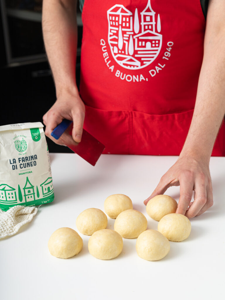 Formiamo quindi delle palline da 80–100 g l’una, pirlandole (cioè dando una forma sferica liscia) e lasciamole lievitare nuovamente, fino al triplo del volume iniziale. (circa un’ora e mezza)