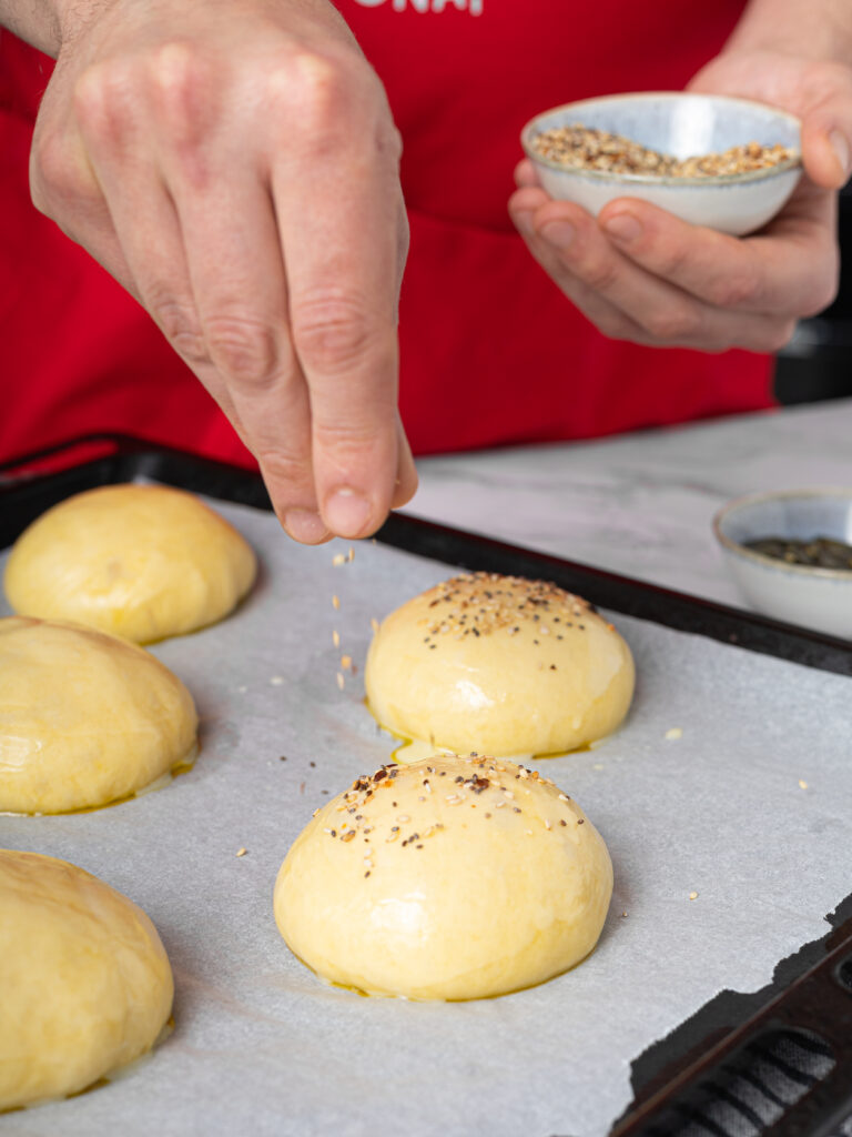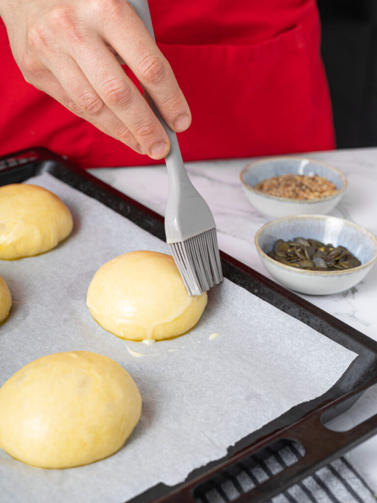 Spennelliamo la superficie con latte o uovo sbattuto e, a piacere, decoriamo con semi di sesamo o di zucca.