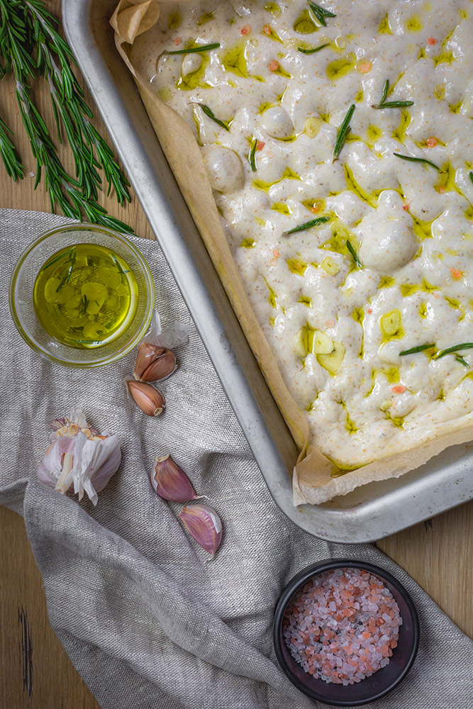 Cospargere la focaccia con poca farina e stendere bene l’impasto creando un bordo ai lati. Coprire e lasciare riposare di nuovo per 1 ora.
