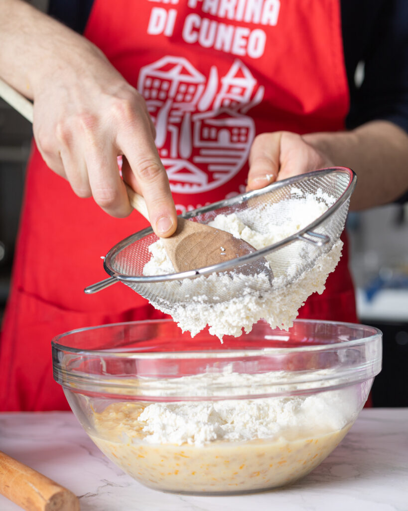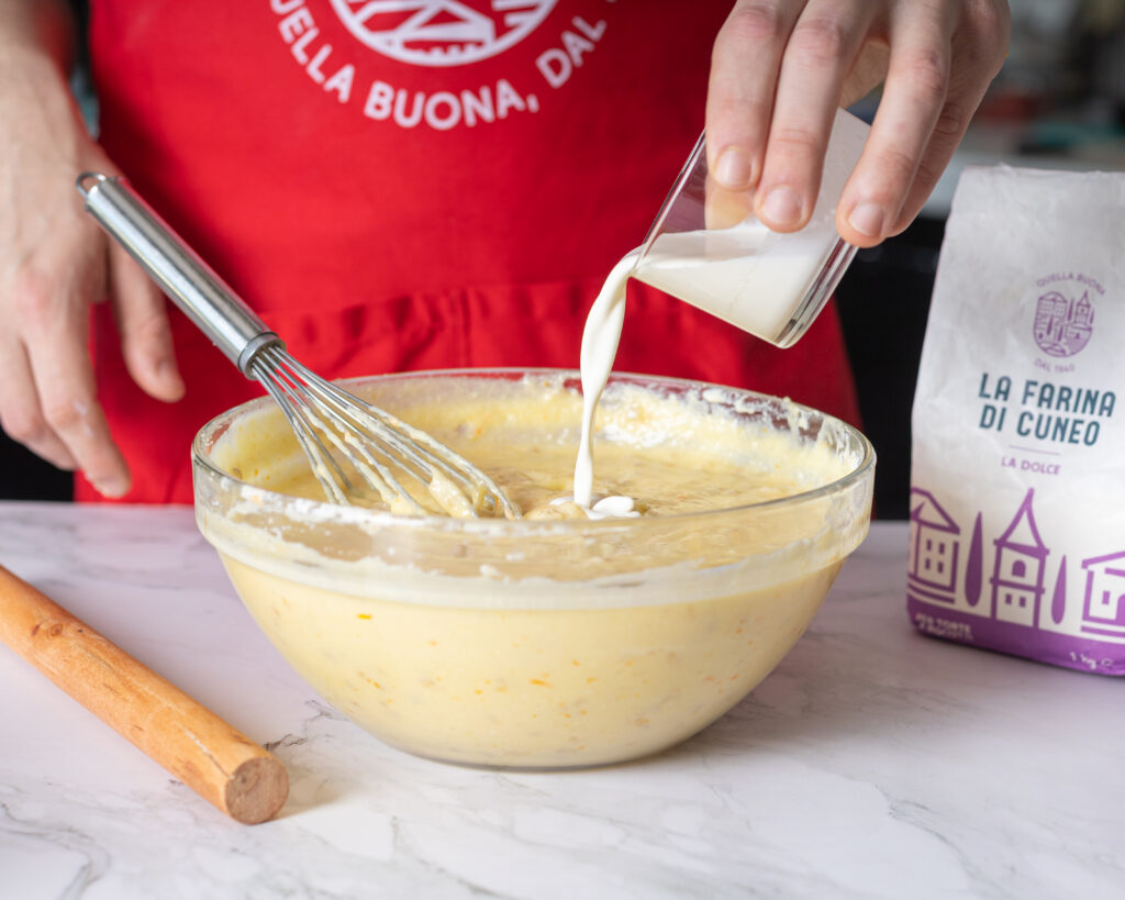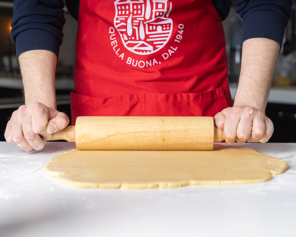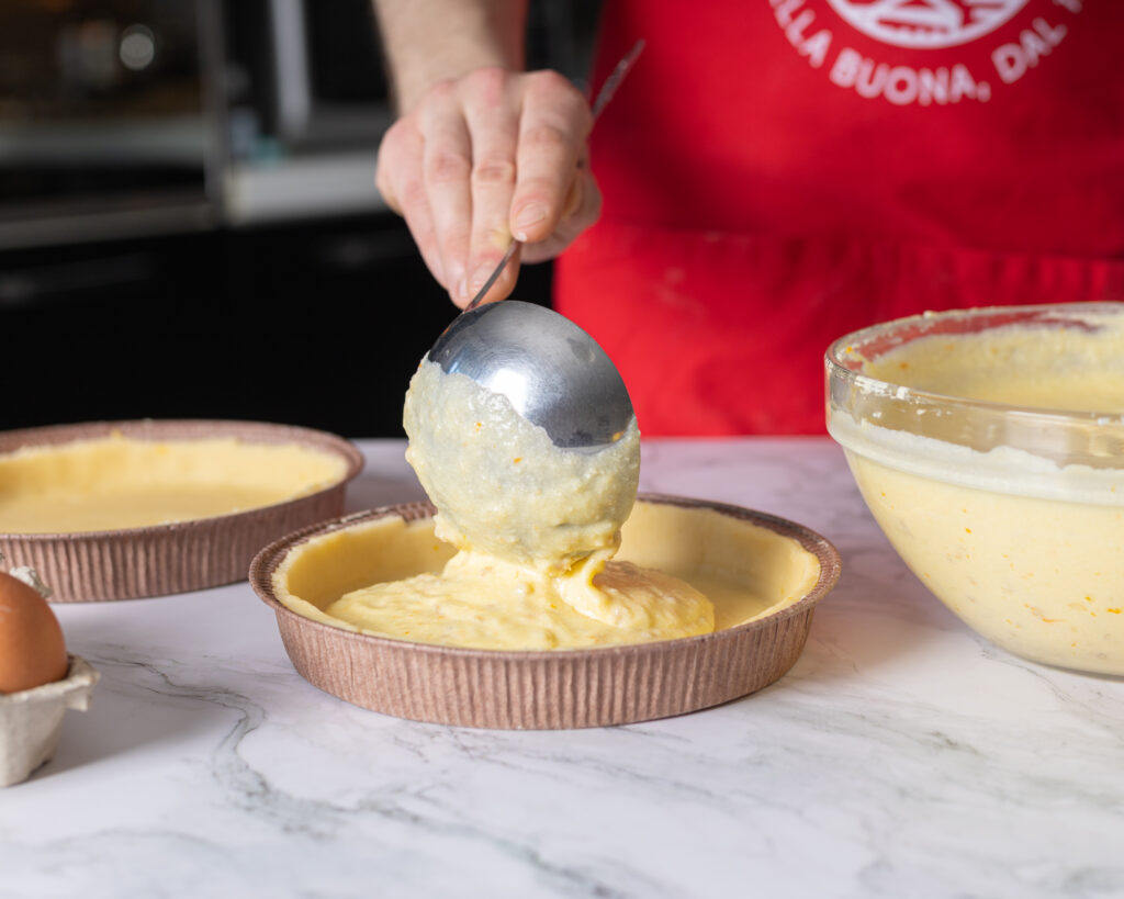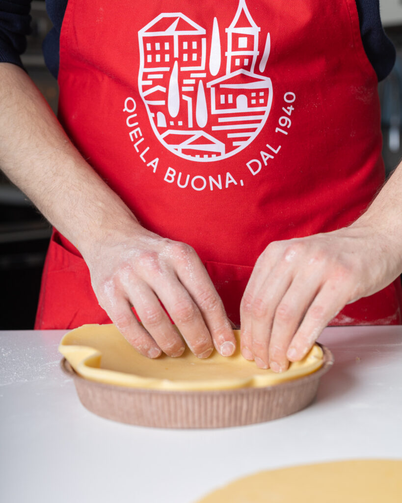 Iniziamo sabbiando il burro freddo con la farina La Dolce e gli aromi. Aggiungiamopoi il sale e il lievito per dolci, mescoliamo bene, e infine incorporiamo il tuorlo e leuova. Continuare a lavorare l’impasto finché non diventa compatto. Quando èpronto, avvolgiamo nella pellicola trasparente e riponiamolo in frigorifero per almeno2 ore.