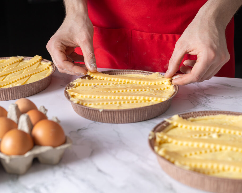 La consistenza della Pastiera Sorrentina tende a rimanere più umida, grazie a una farcia ricca, arricchita con crema pasticcera agrumata che le conferisce una texture morbida e avvolgente.