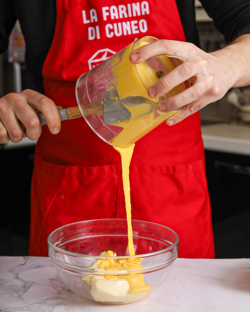 Aggiungete il composto al burro morbido (a pomata) e montate con le fruste elettriche o con la planetaria fino a ottenere una massa spumosa.