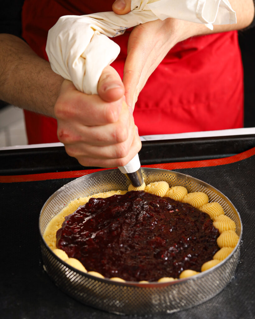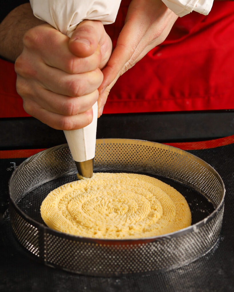 Trasferite l’impasto in una sac à poche con bocchetta rigata e foderate un anello microforato o uno stampo per crostata precedentemente imburrato.