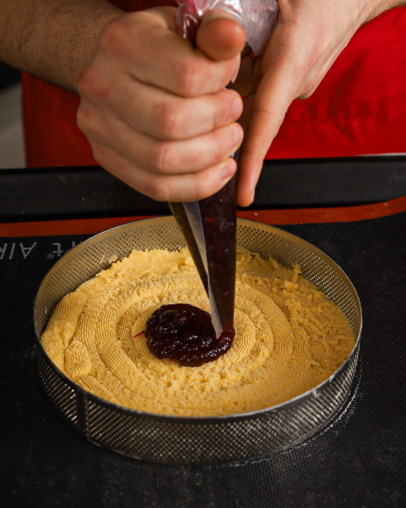 Riempite la base con la confettura, lasciando circa 1 cm dal bordo.
