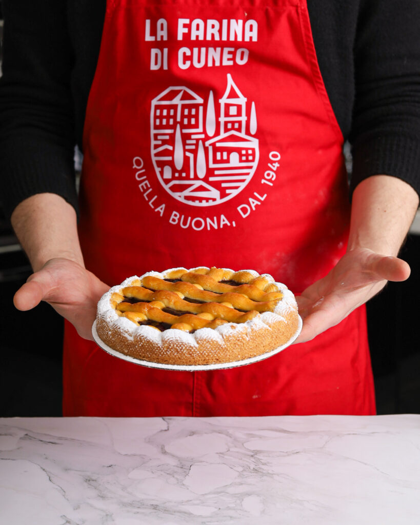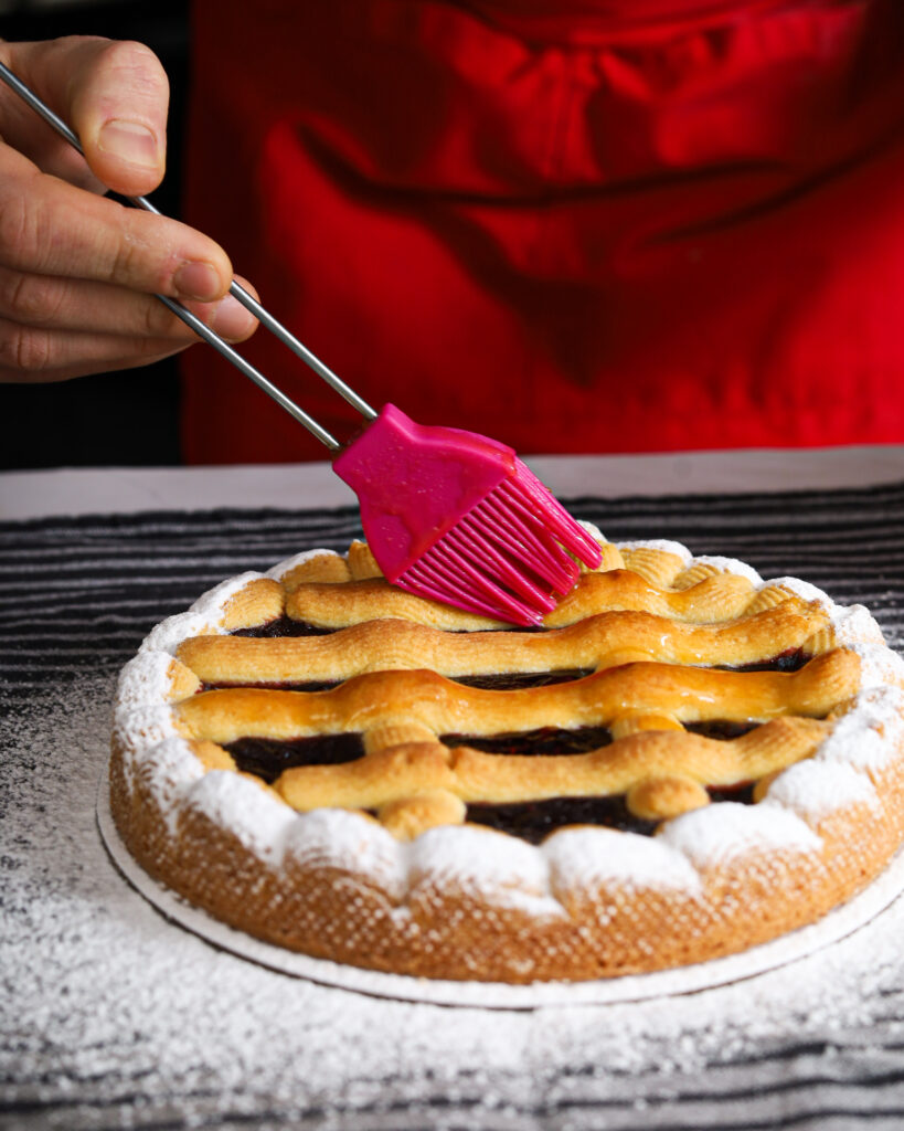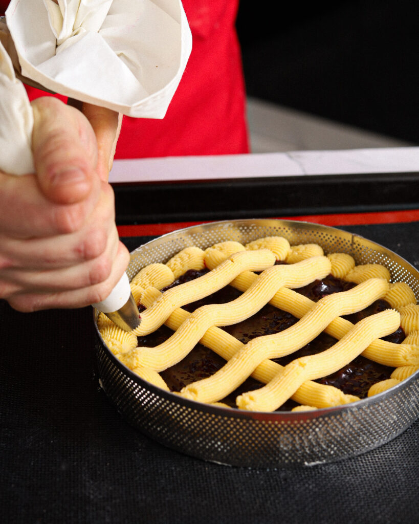 Con la pasta rimanente, create le classiche losanghe e l’iconico bordo decorato che distingue questa torta dalle altre crostate.
